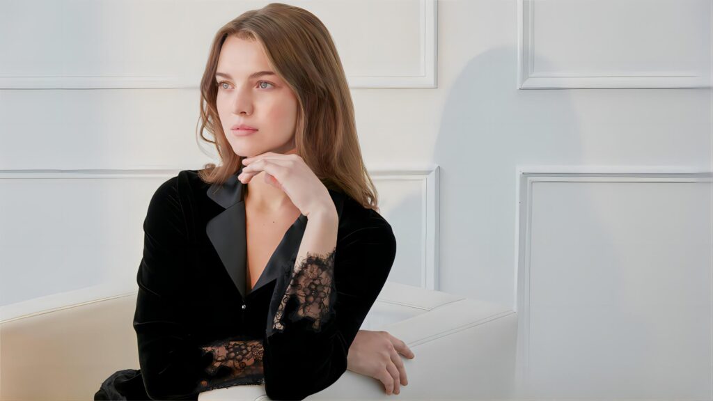 Model wearing MANITO's ivory script-pattern silk pajama set in a modern lounge chair.