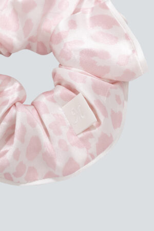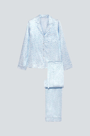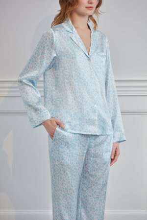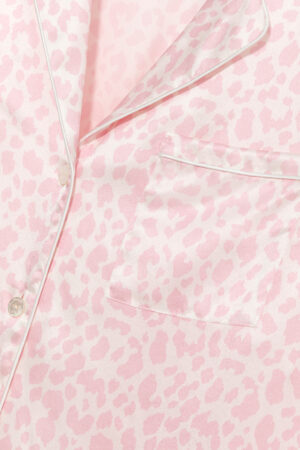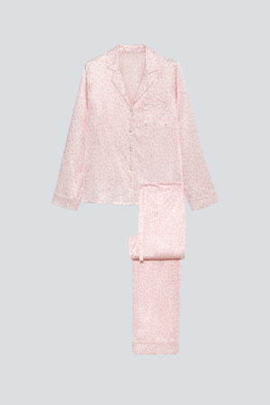 Model in MANITO pink monogram print silk pajama set with a relaxed silhouette.
