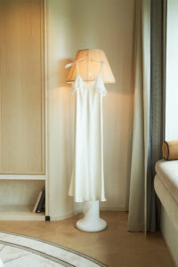 The Aurora Collection draws inspiration from the gentle moment of sea breezes, featuring delicate tailoring of a slimming silhouette. 30-momme mulberry silk with georgette, creating a playful contrast of textures. Every delicate detail embodies whimsical ingenuity, while masterful craftsmanship reinterprets the elegant dressing aesthetics of contemporary women.