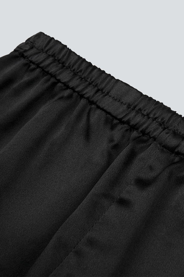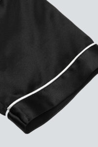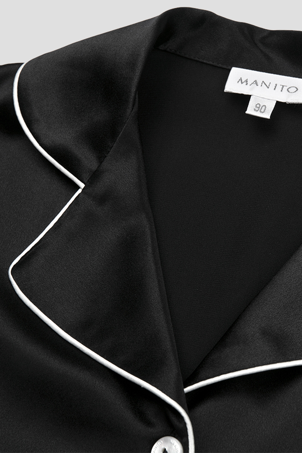 Soft woven mulberry silk gently cares for the skin. Natural mother-of-pearl buttons and piping along the collars create an exquisitely delicate pajama set.