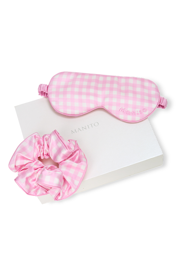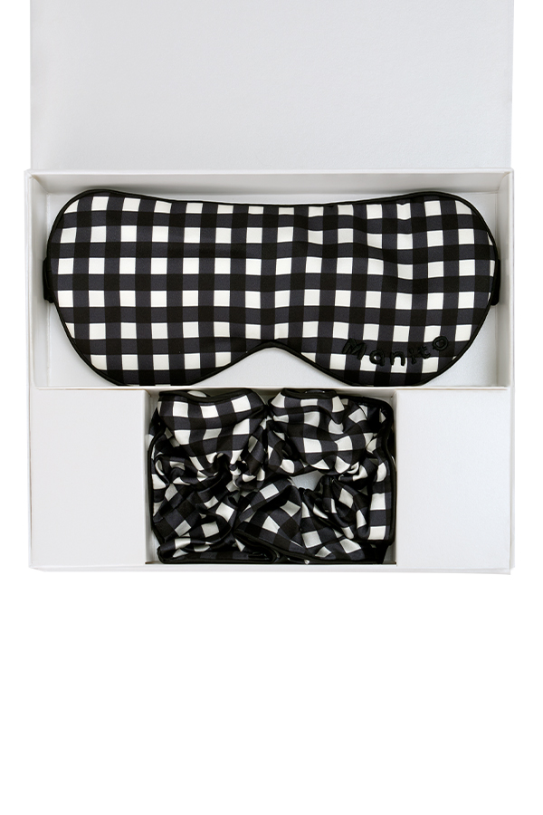 This silk sleep mask, crafted from 19mm stretch silk charmeuse with a subtle check pattern, is lined with even softer 22mm silk for cloud-like comfort. Delicately edged with piping, it comes with a matching scrunchie featuring brand embroidery. A perfect gift of understated luxury, where every touch feels like a line of tender poetry.