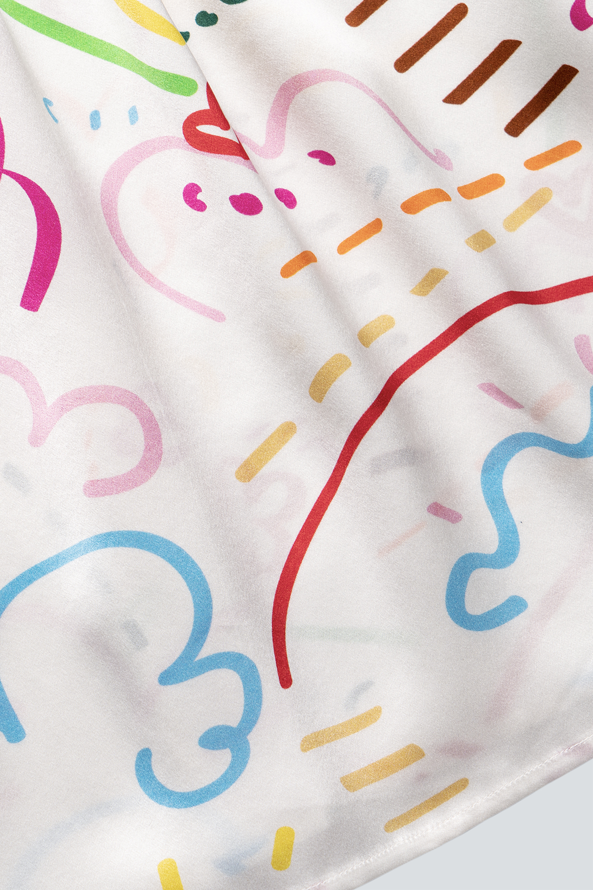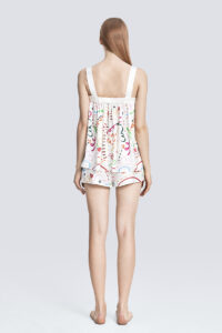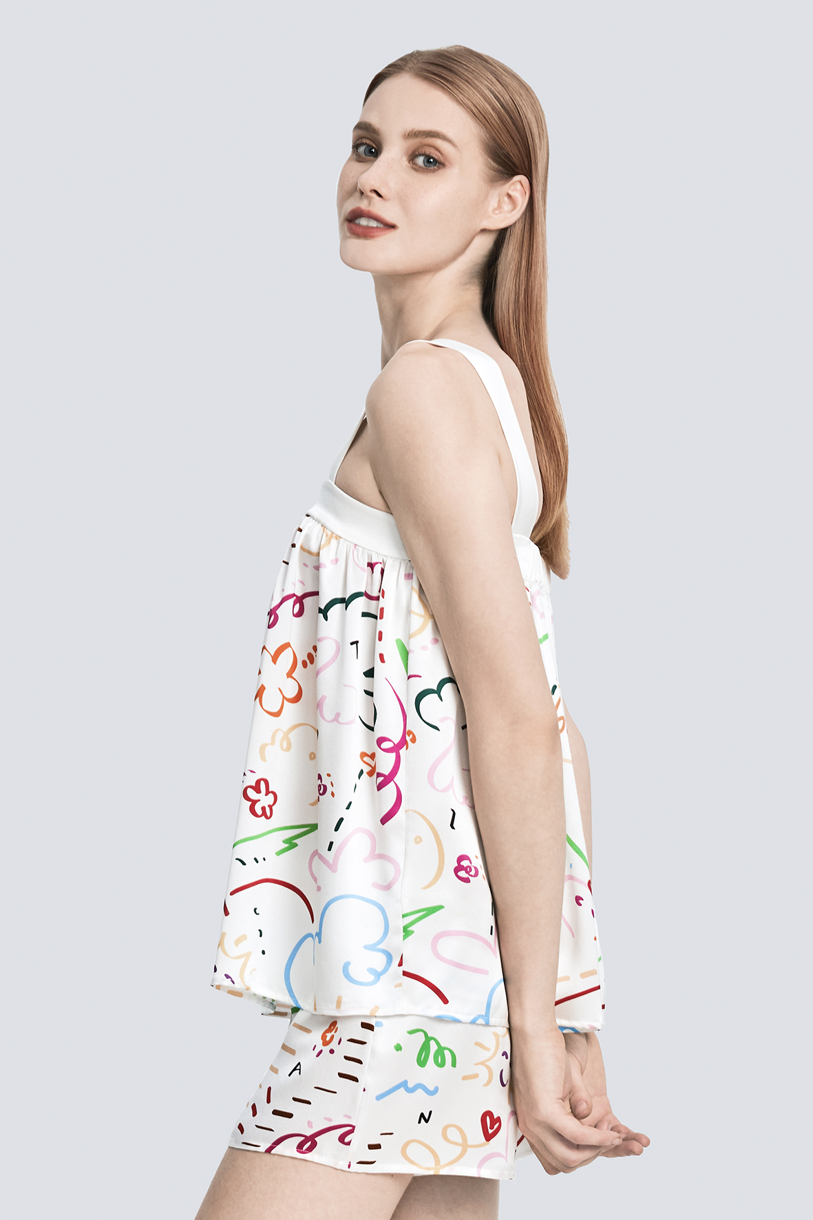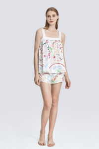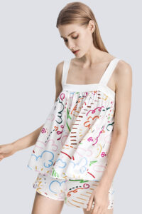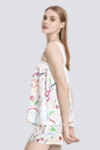 Its pure and sincere emotion plays a gentle love song of spring. The abstract floral print design is playful and cute. The fabric is made of 22 mm stretch satin silk, which is soft and smooth.