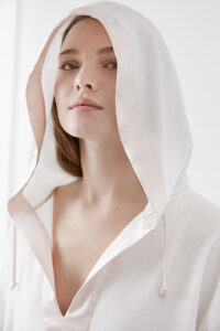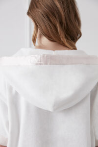 The soft, cozy terry fabric is highly absorbent, warm and light on the body. The hem, hood line and inner piping are all in charmeuse silk for a highly inclusive fit.