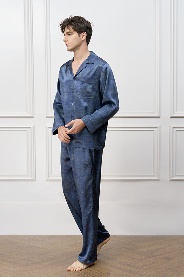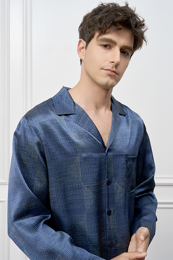 Redefining sleepwear with geometric precision, this set crafts moonlight-soft comfort from 22mm mulberry silk satin. The deep blue base features meticulously arranged dot motifs and linear elements, creating a harmonious visual rhythm.