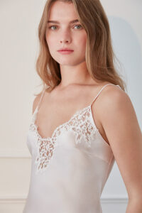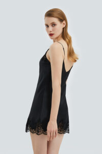 Premium lace at the V-neckline and the hemline, along with thin straps and a deep V at the back, define the elegant lines of your shoulder and hug your curves perfectly.