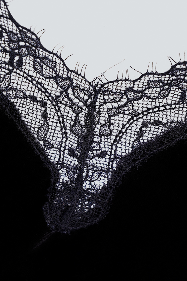 The Luella collection uses gorgeous mulberry silk velvet fabrics with sexy lace, making the details exquisite. The slim cut highlights skin texture and makes the dress shine with the body moving.