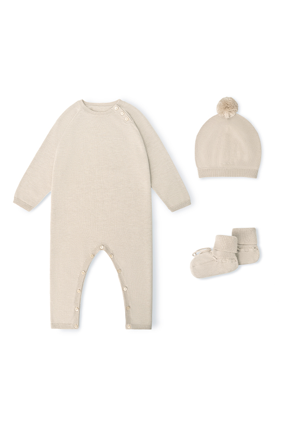 Crafted from a premium blend of silk, cashmere, and wool, this baby knit set offers a luxuriously soft and smooth touch, providing gentle warmth and comfort for a baby’s sensitive skin. Rendered in a natural sand-camel hue, its minimalist design boasts timeless appeal, making it a versatile and cherished layering piece for your little one.