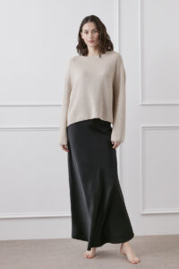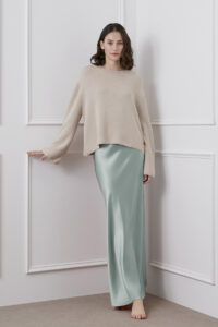 The outerwear design features a fashionable fit, with a diagonally cut body, creating an elegant and harmonious silhouette. It is crafted with 22-Momme silk crêpe satin (Soft Light®) to deliver a smooth and lustrous texture.