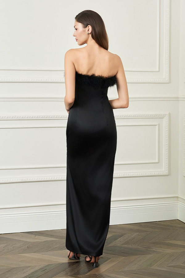 The New Diva Collection reinterprets dreamlike elegance with graceful feather-trimmed details. This dress features a delicate ostrich feather-trimmed neckline that sways with every movement. Its clean, fluid lines flatter the silhouette, bringing a breath of romantic charm to everyday moments.