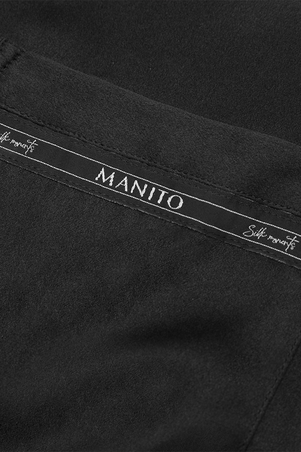 The MANITO Noir Ruban Collection showcases timeless tailoring infused with trendy elements, such as iconic logo accents and adorned straps, resulting in an elevated and fashionable ensemble.