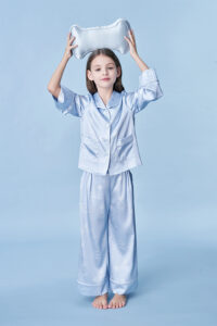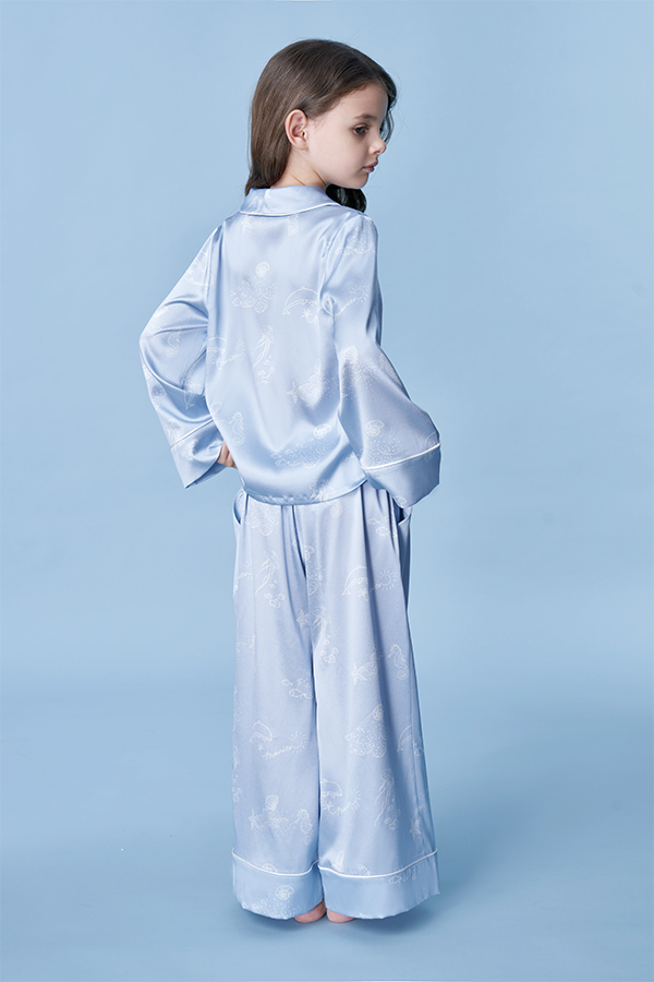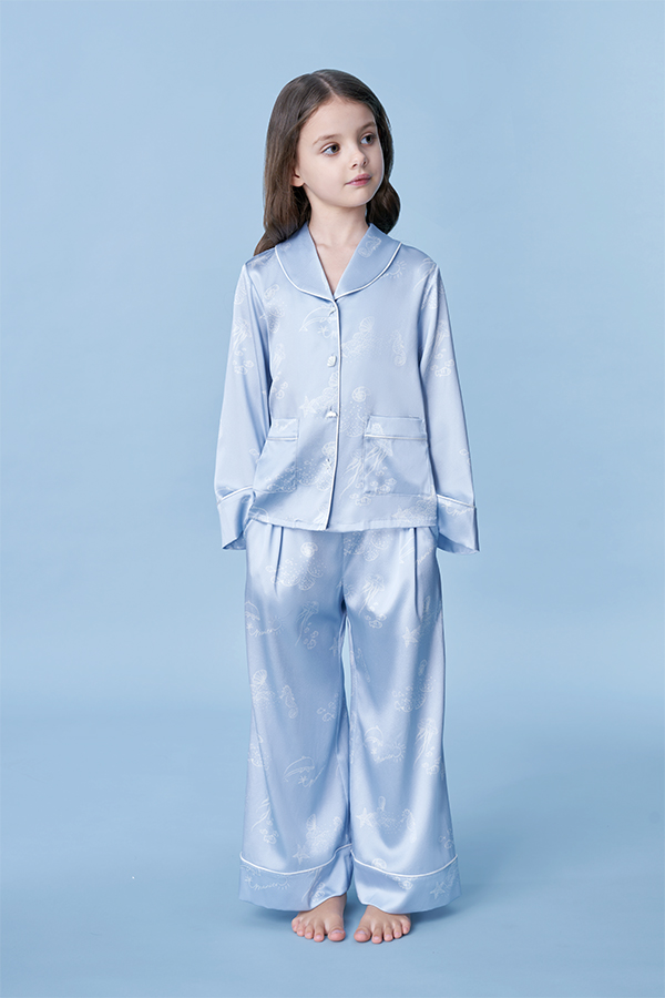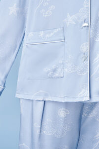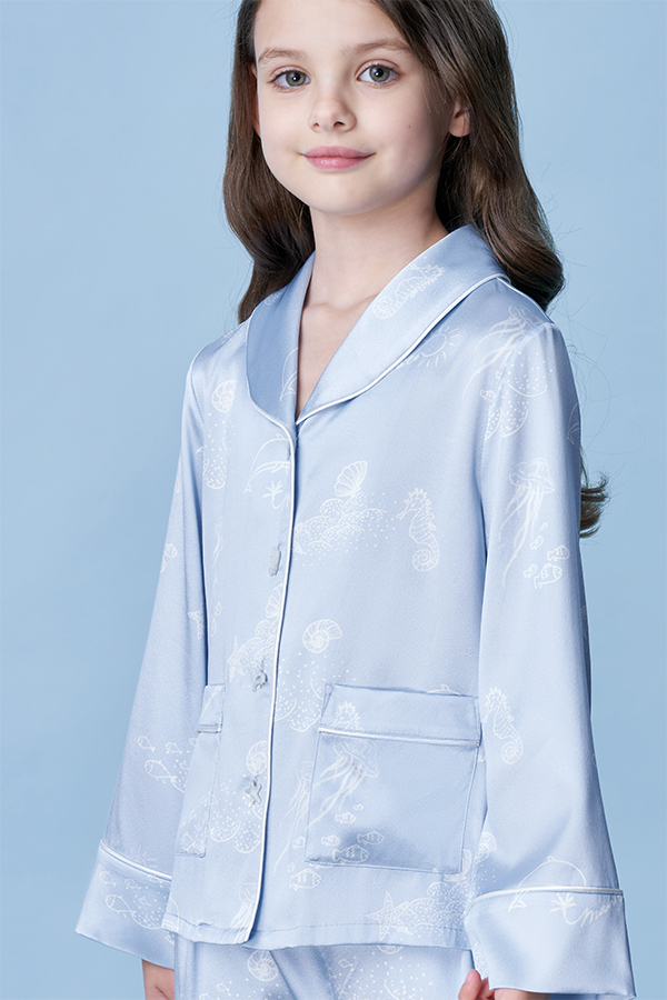 The Ocean Blue collection draws its inspiration from the vibrant SeaWorld. Featuring a soft blue base, the design incorporates hand-drawn white lines to depict various marine elements, adding a playful and approachable charm. Crafted from high-quality natural mulberry silk, offers exceptional comfort and a skin-friendly feel.