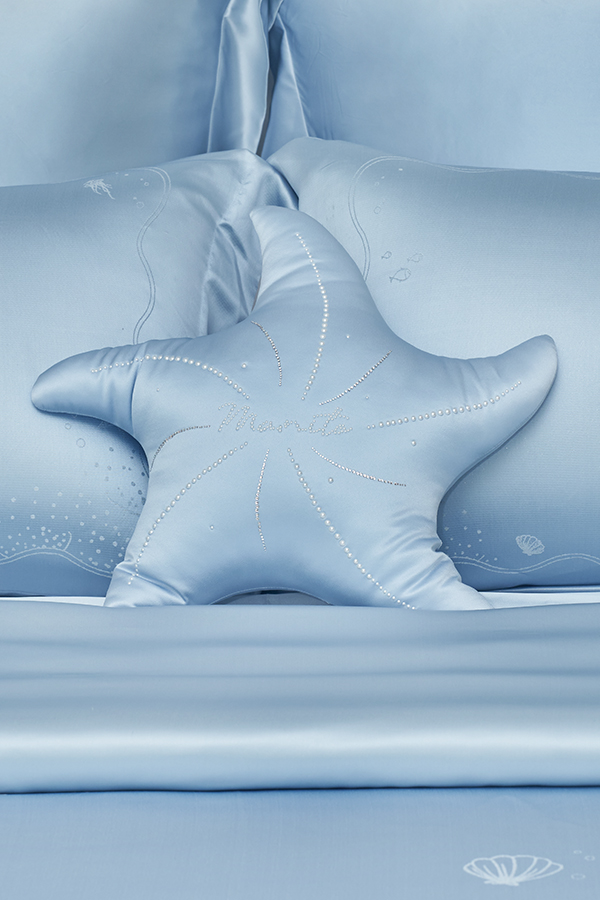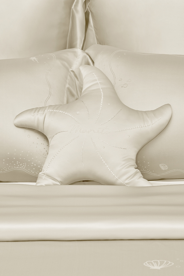 The Ocean Starfish Pillow takes inspiration from sunlit coastlines with its starfish-shaped design, sparkling Swarovski crystals mimic glistening ocean waves, adding a touch of radiant elegance. Crafted from 22 momme mulberry silk, its texture as gentle as a breeze caressing the skin. Transforming home corners into a whimsical haven where marine magic meets luxurious comfort.