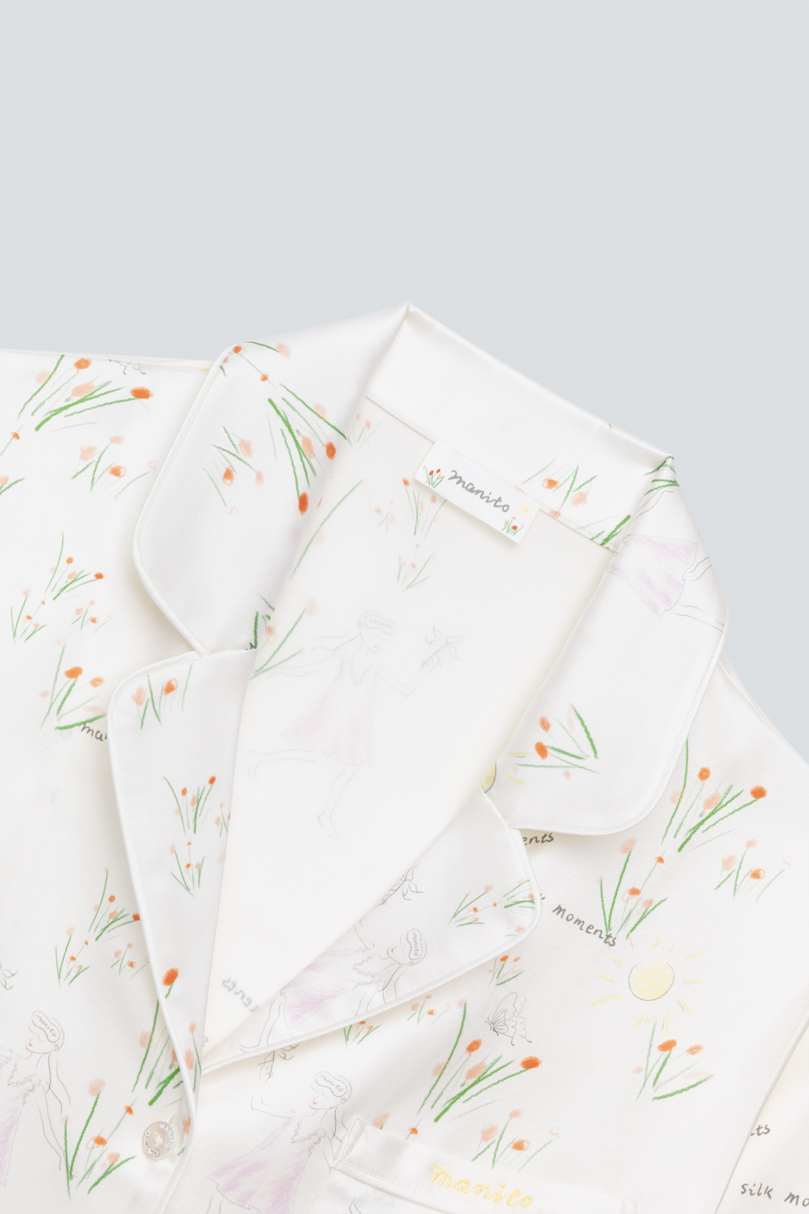 MANITO weaves the Princess’s idyllic moments in the garden with the 24SS Collection through delicate silk fabrics, exuding elegance and style. The classic pure white color is punctuated by colorful flowers and figures, adding a touch of vitality and fashion to the collection, while remaining fresh and romantic.