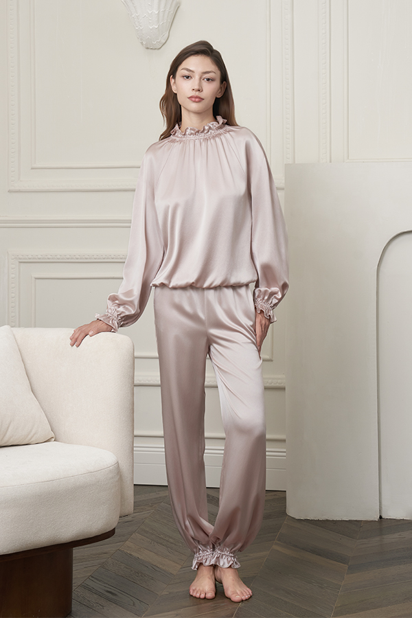 This set features elastic cuffs and hem, with a relaxed fit that allows complete freedom of movement. The delicate ruffle detailing adds a touch of elegance to everyday loungewear, perfect for both relaxation and casual activities at home.