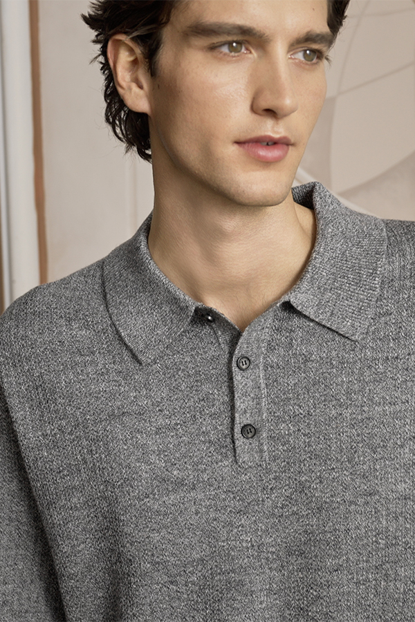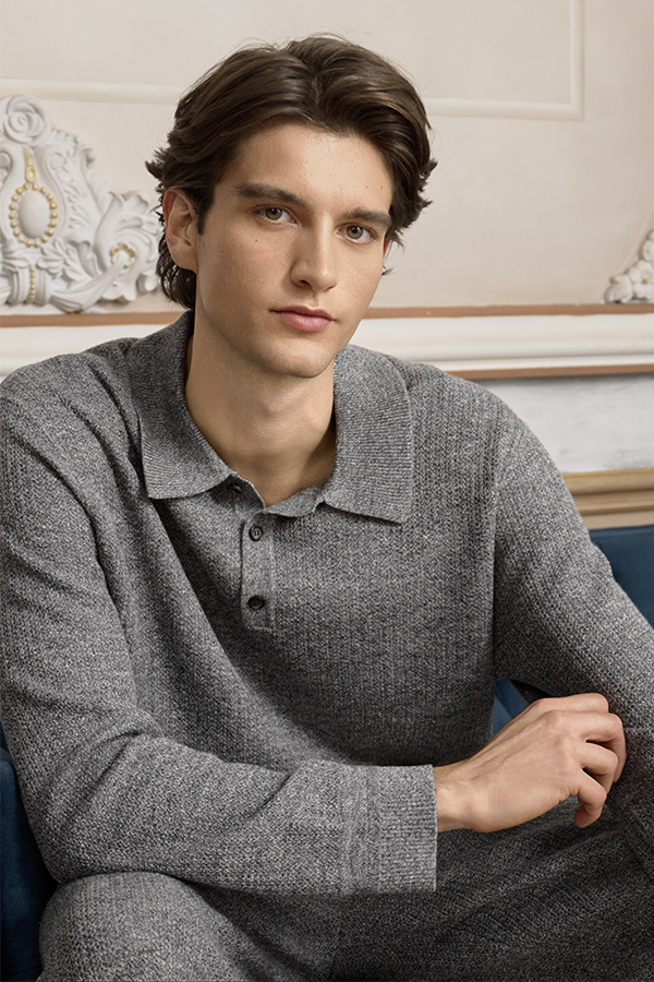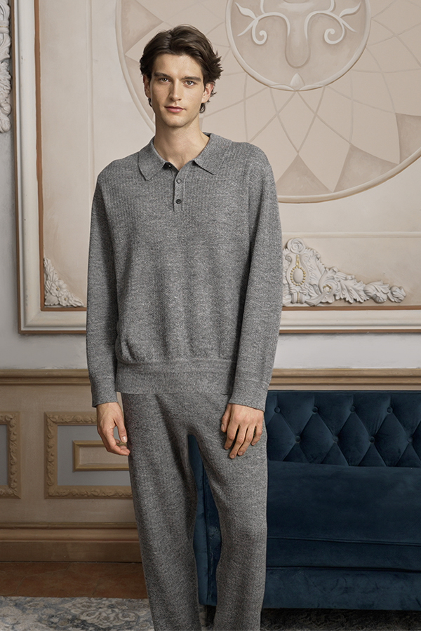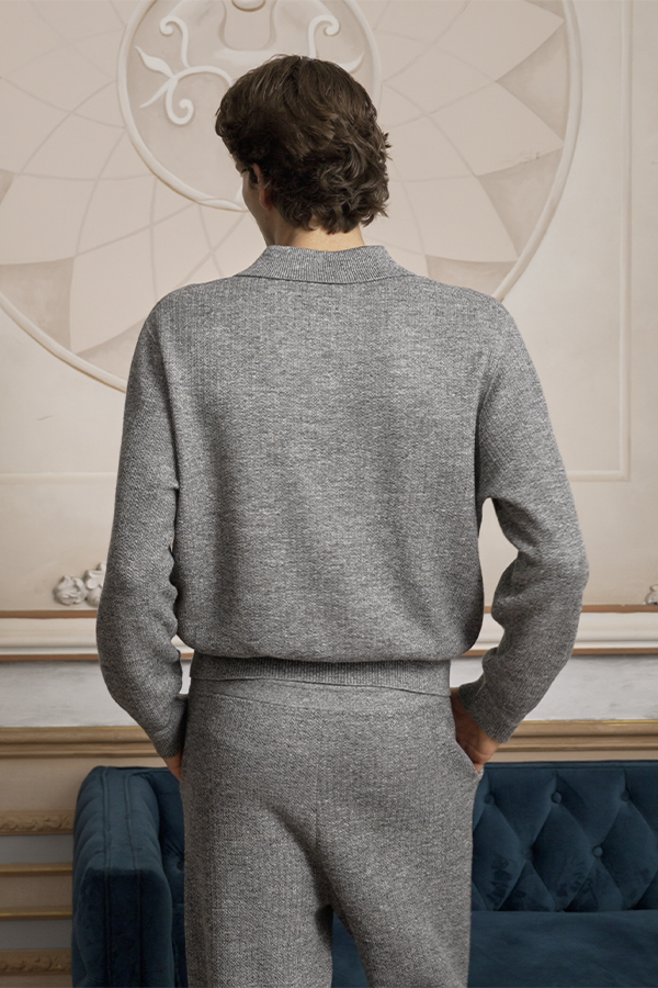 The Terra Collection finds its muse in the rugged textures and organic patterns of primitive stone. The men’s knitwear set showcases a sophisticated marled weave, blending laid-back comfort with refined elegance for the modern gentleman. Its versatile design transitions effortlessly from cozy loungewear to stylish casual wear.