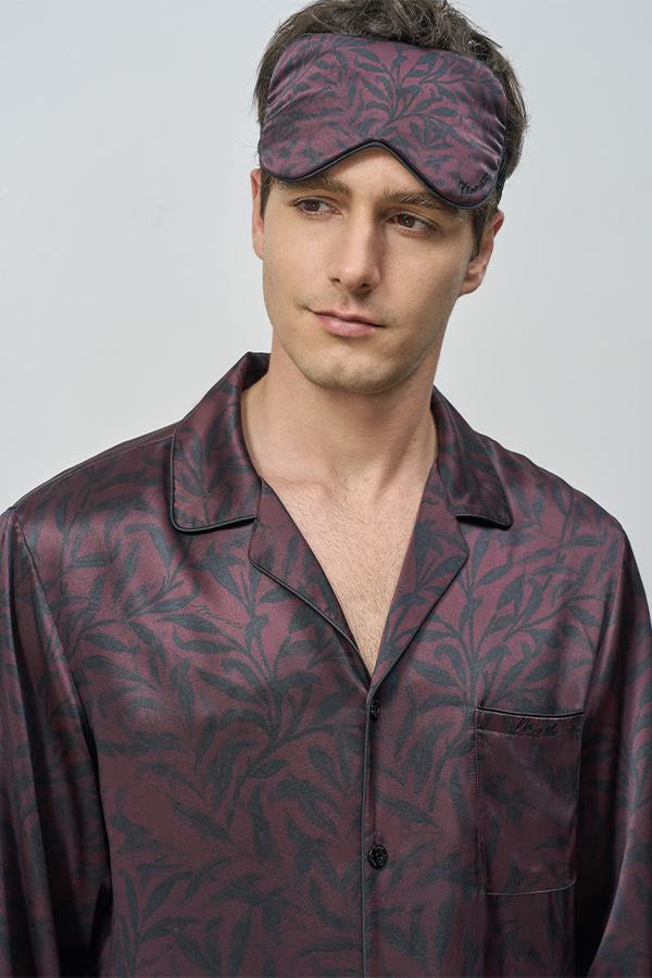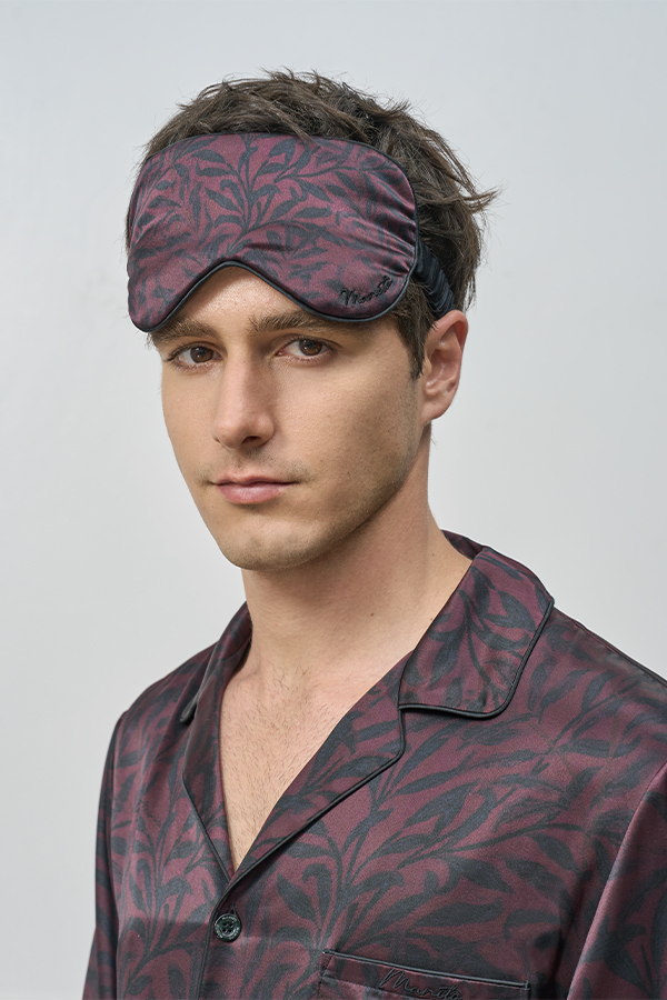 This artisanal silk sleep mask redefines rest with botanical elegance. Featuring digitally-printed foliage motifs in rich cocoa hues, the design pairs three-dimensional embroidered branding for a play of texture and depth. Matte stitching complements the gradient leaf patterns, creating a sophisticated bedroom accessory that marries luxury with artistic detail.