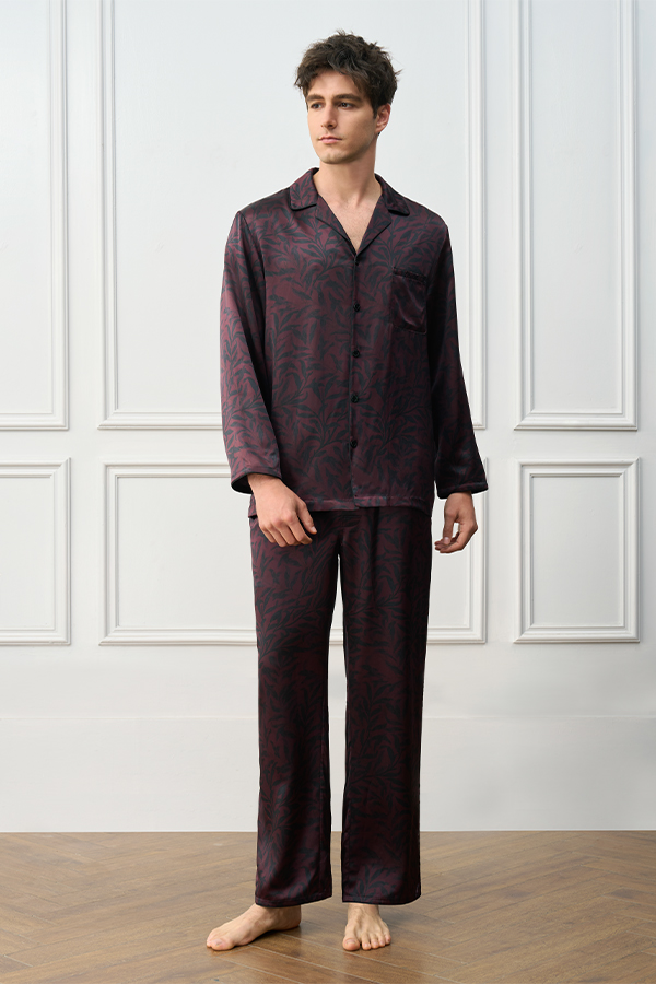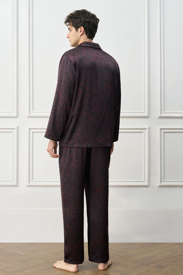 This men’s loungewear set redefines relaxed elegance with nature-inspired aesthetics. Featuring hand-drawn botanical motifs on a rich cocoa base with matte black buttons, it evokes the quiet sophistication of twilight forests. The ergonomic tailoring offers a sculpted yet unrestrictive fit through strategic articulation at sleeves and legs. Minimalist lines and organic prints create refined, ready-to-wear sophistication for elevated downtime.
