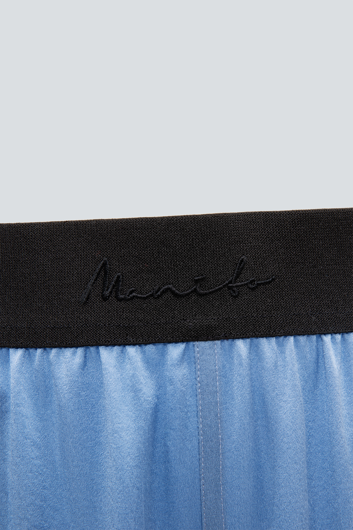 Made of 22-momme stretch silk satin, the custom-dyed shell button radiates a luxurious multicolored sheen, complementing the silk material. The traditional shirt style, with its smart collar, emphasizes the face while elongating the neck, resulting in an elegant proportion.